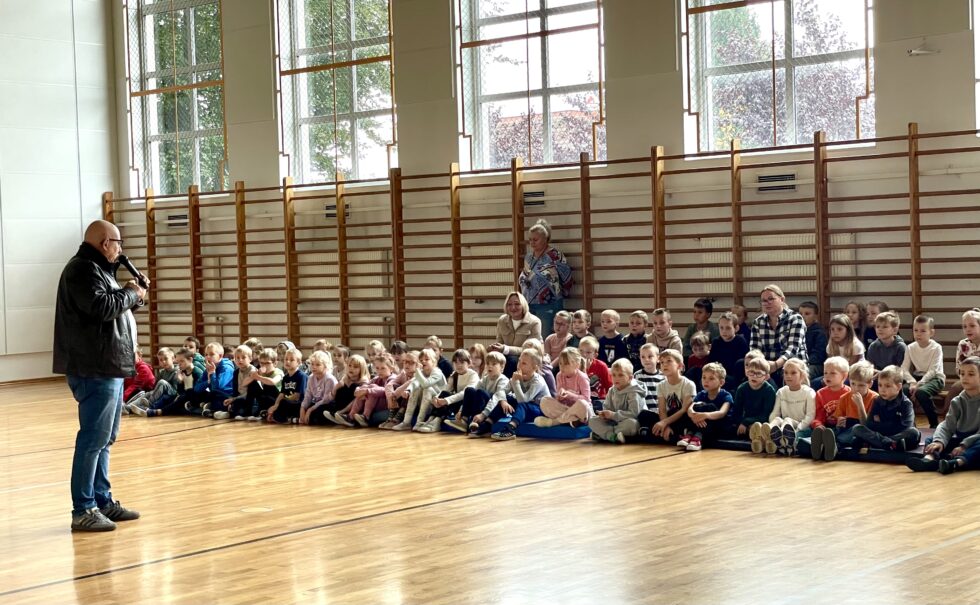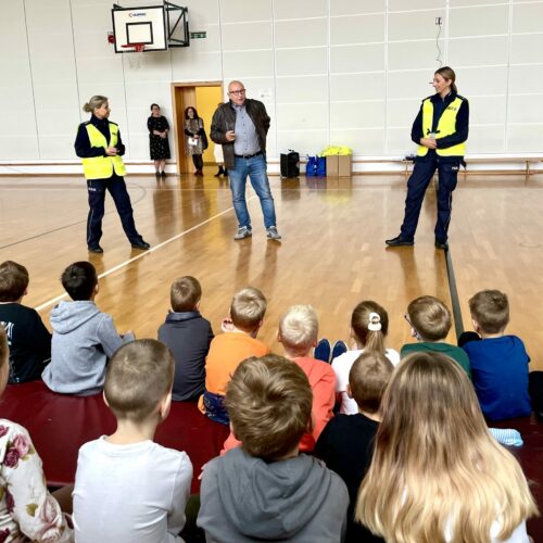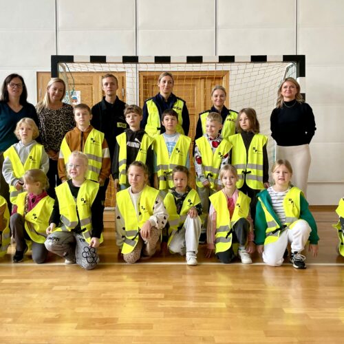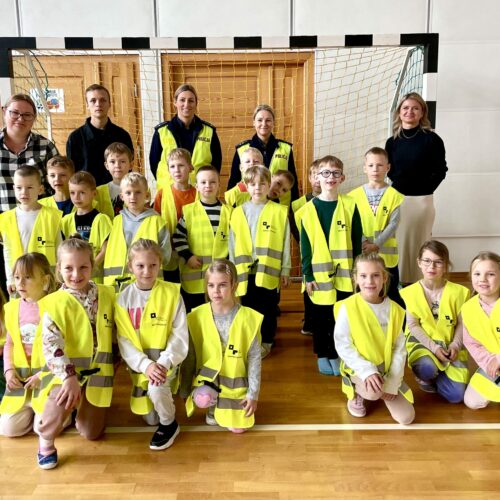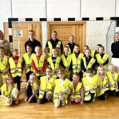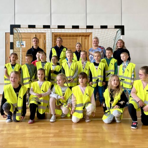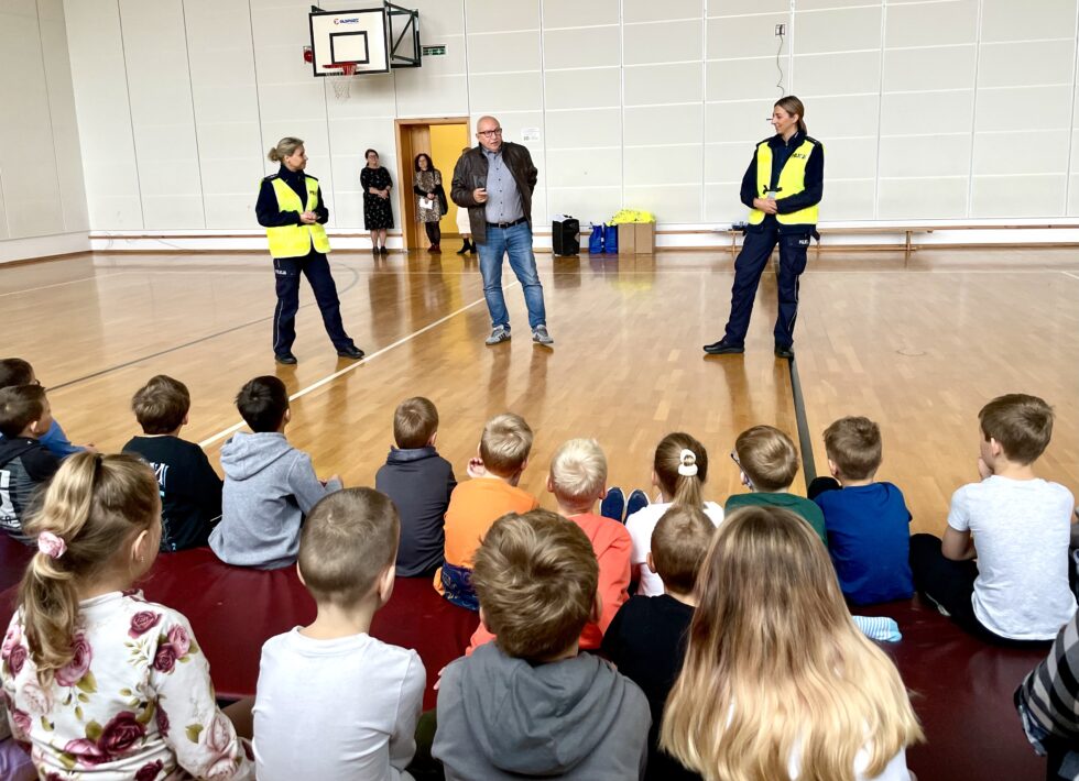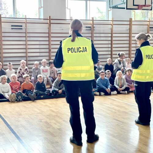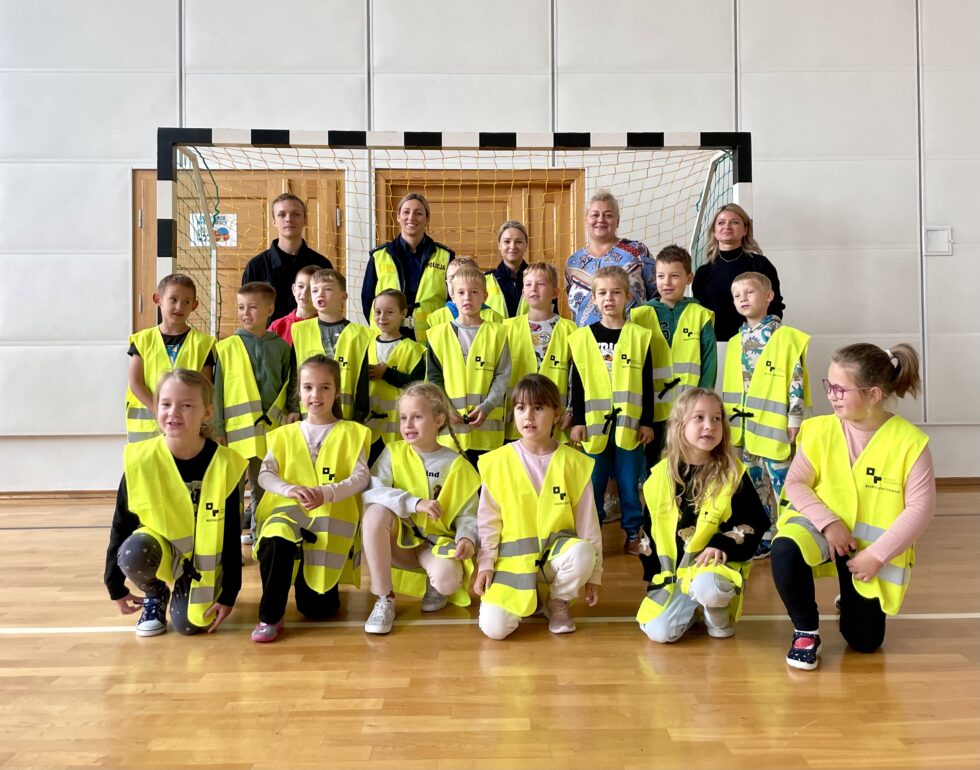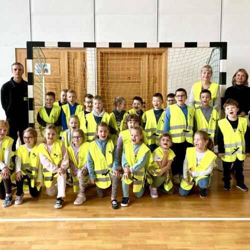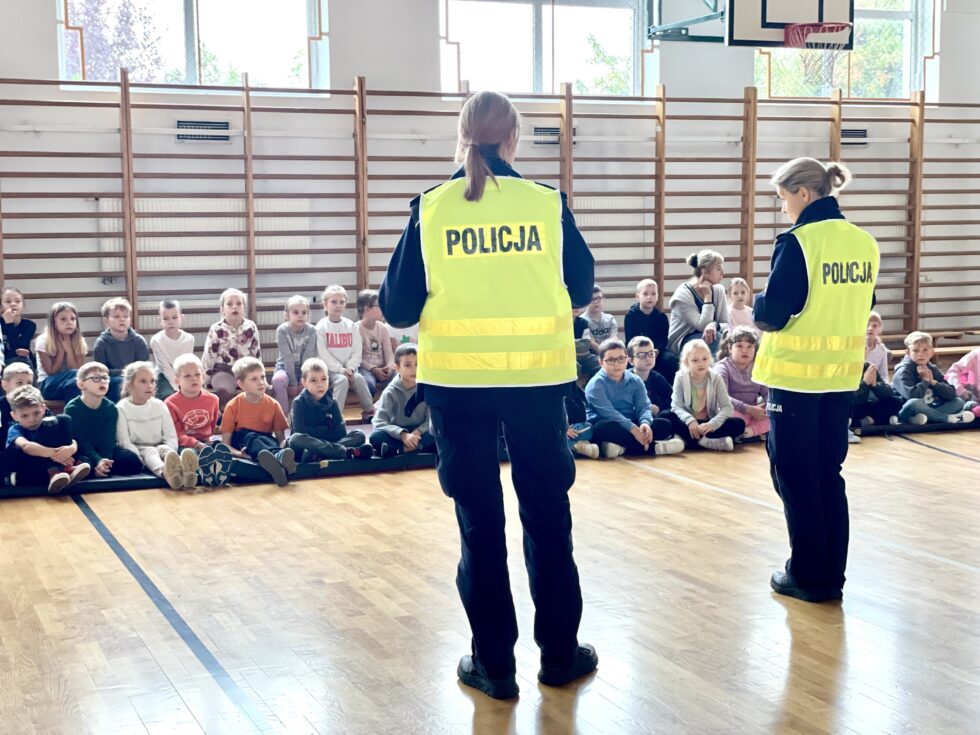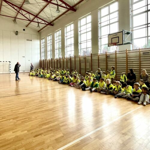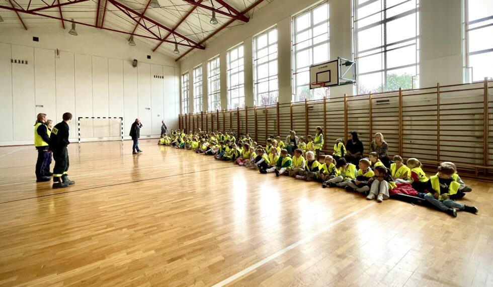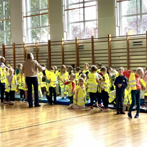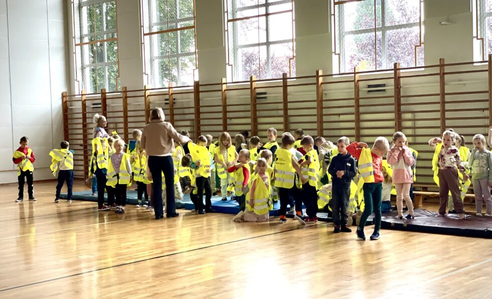 Oprócz wręczania kamizelek, odbyła się też krótka prelekcja, podczas której dzieci uczyły się zasad poruszania się po drogach, zachowania w sytuacjach zagrożenia oraz tego, dlaczego warto być widocznym. Tłumaczono uczniom, że kamizelki zdecydowanie podnoszą poziom bezpieczeństwa pieszego i rowerzysty, nie tylko po zmroku, ale także w dzień. Trzeba jednak pamiętać o tym prawidłowo je nosić, żeby były widoczne i spełniały swoją funkcję. Przy okazji wspomniano też o numerze alarmowym 112, pod który trzeba dzwonić w sytuacji zagrożenia życia czy zdrowia. Jak się okazało, pierwszoklasistom większość zasad ruchu jest dobrze znanych, a ich pytania dotyczyły między innymi zasad poruszania się na hulajnodze.