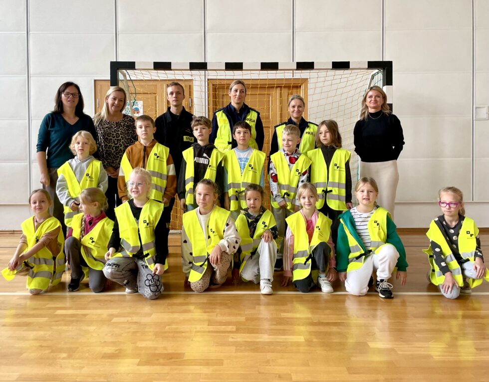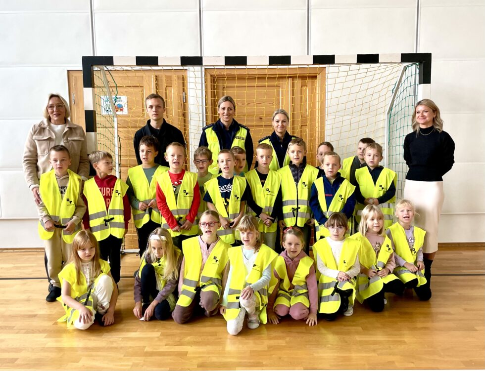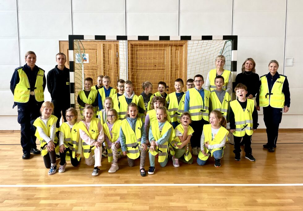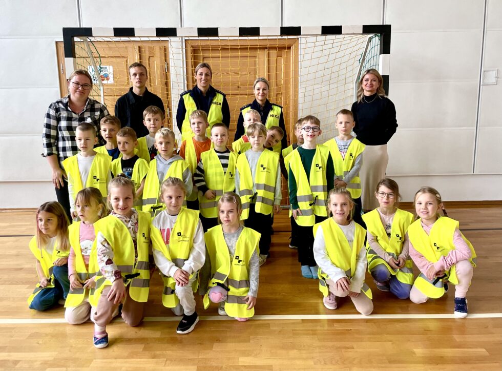 Na zakończenie spotkania uczniowie otrzymali kamizelki odblaskowe i ustawili się do pamiątkowych zdjęć.