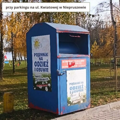 Do pojemników tych należy wrzucać odzież i tekstylia nadające się do użycia. Niezdatną do użycia, odpadową odzież i tekstylia należy dostarczyć do Punktu Selektywnej Zbiórki Odpadów Komunalnych zlokalizowanego na terenie ZGK Sp. Z O.O. na ul. Przemysłowej 10 w Buku.