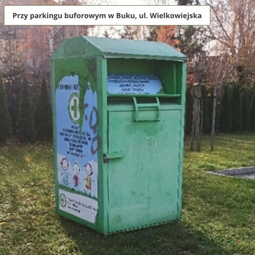 Do pojemników tych należy wrzucać odzież i tekstylia nadające się do użycia. Niezdatną do użycia, odpadową odzież i tekstylia należy dostarczyć do Punktu Selektywnej Zbiórki Odpadów Komunalnych zlokalizowanego na terenie ZGK Sp. Z O.O. na ul. Przemysłowej 10 w Buku.