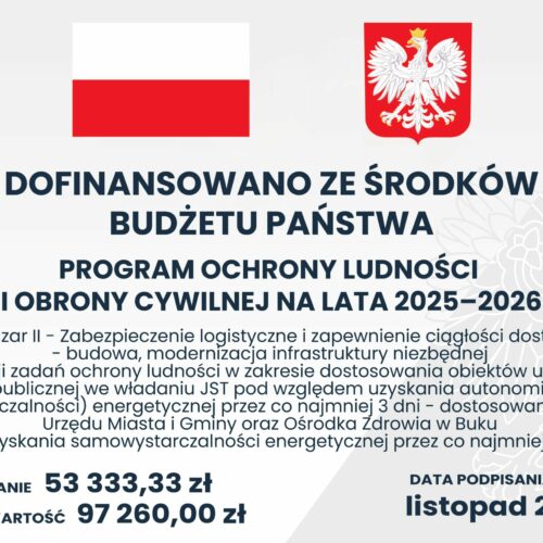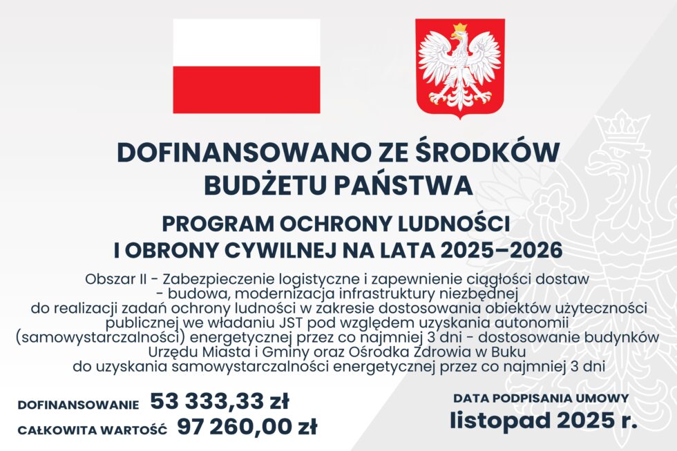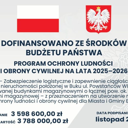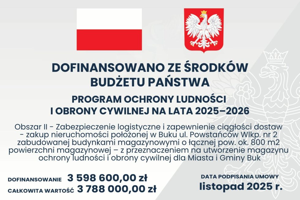 W 2025 roku, w ramach realizacji Programu Ochrony Ludności i Obrony Cywilnej na lata 2025 – 2026, Burmistrz Miasta i Gminy Buk zawarł z Wojewodą Wielkopolskim umowy o udzielenie dotacji celowych z budżetu państwa.