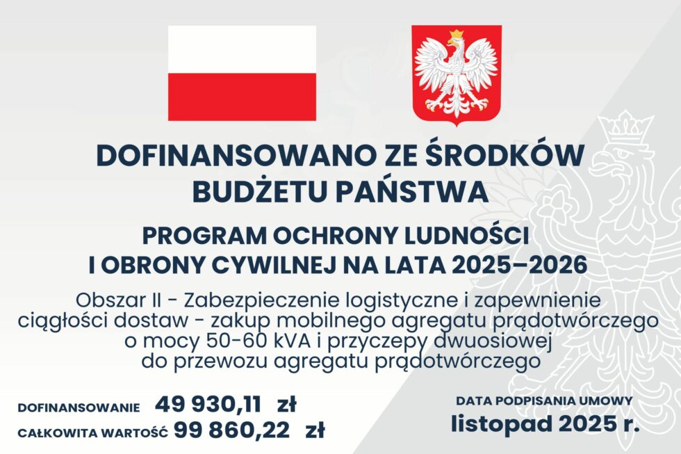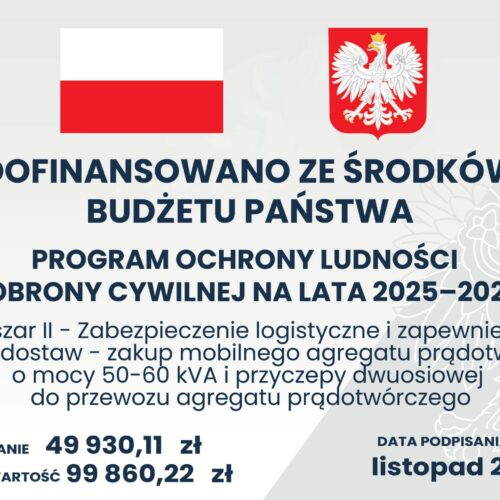 - zakup agregatu prądotwórczego o mocy pow. 50 kVA wraz z przyczepą transportową;