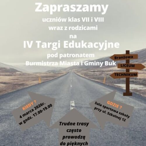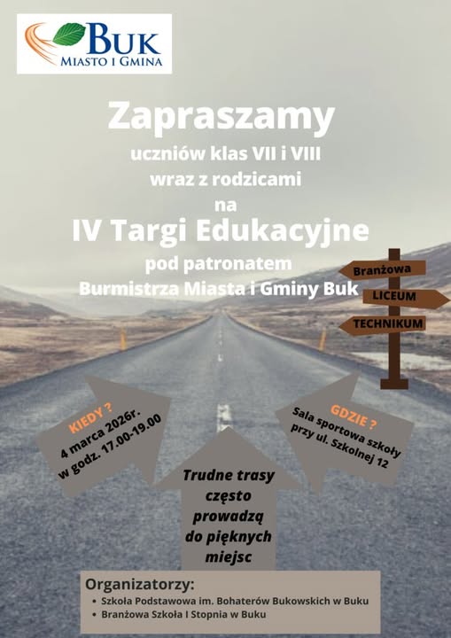Zapraszamy na IV Targi Edukacyjne, ktore odbędą sie 4 marca 2026 roku w godzinach 17:00-19:00 w sali sportowej Szkoły Podstawowej im. Bohaterów Bukowskich przy ulicy Szkolnej 12.