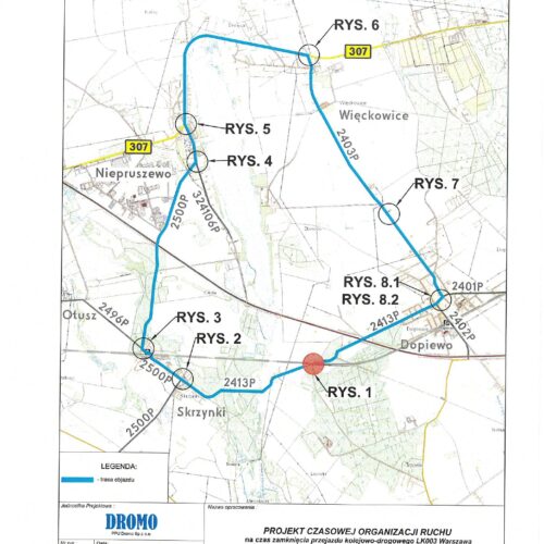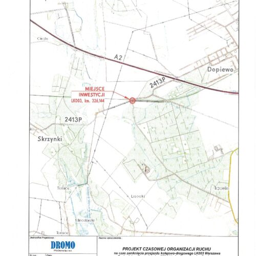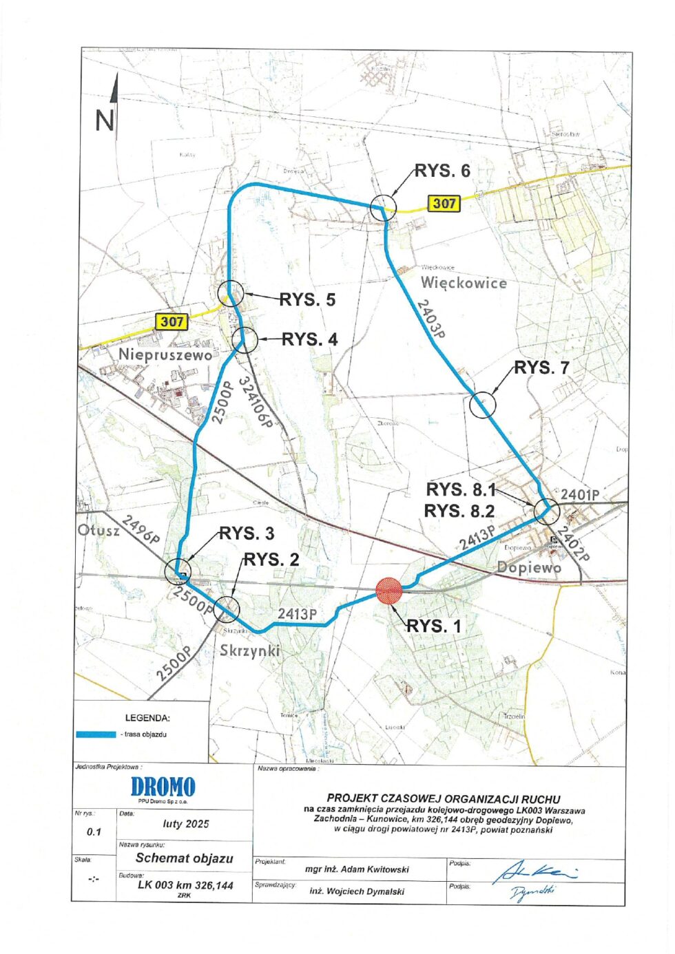 W związku z remontem przejazdu kolejowo-drogowego lk 003 w km 326,144 Warszawa Zachodnia – Kunowice obręb geodezyjny Dopiewo, w ciągu DP 2413P, powiat poznański informujemy, że w/w przejazd zostanie zamknięty od dnia 04.03.2026r. godz. 07:00 do dnia 06.03.2026r. godz. 22:00 oraz w dniu 15.03.2026r od godz. 16:00 do godz. 22:00. Objazd poprowadzony zostanie zgodnie z załączonym schematem. Za powstałe utrudnienia przepraszamy.