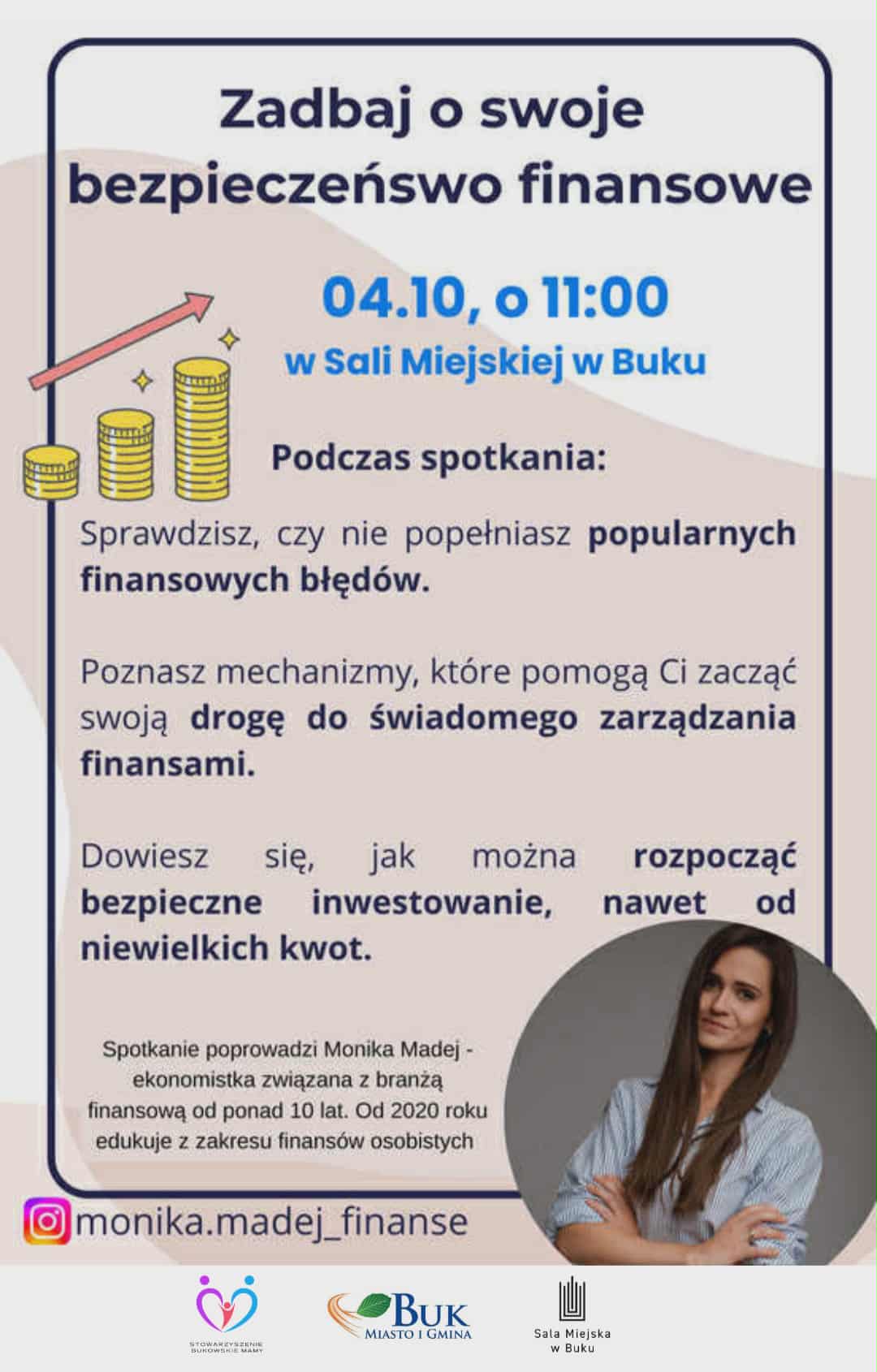 Stowarzyszenie Bukowskie Mamy zaprasza w dniu 4 października br. o godz. 11:00 do Sali Miejskiej na spotkanie z Moniką Madej. Zapisy przez Messenger Stowarzyszenia. Szczegóły na plakacie.