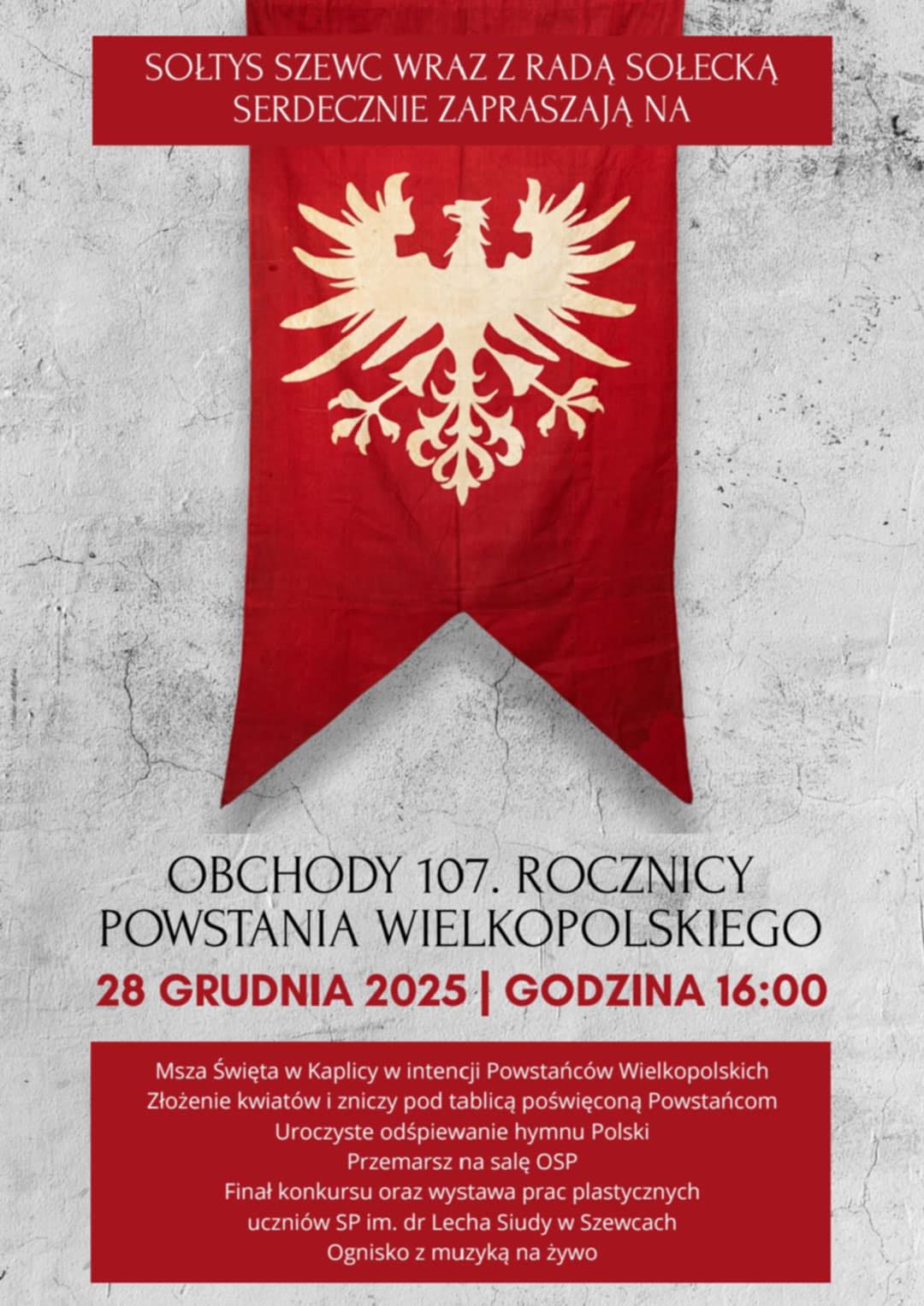 Sołtys Szewc wraz z Radą Sołecką zapraszają na obchody 107. Rocznicy Powstania Wielkopolskiego w dniu 28 grudnia br. o godz. 16:00. W programie: Msza Święta w Kaplicy w intencji Powstańców Wielkopolskich. Złożenie…