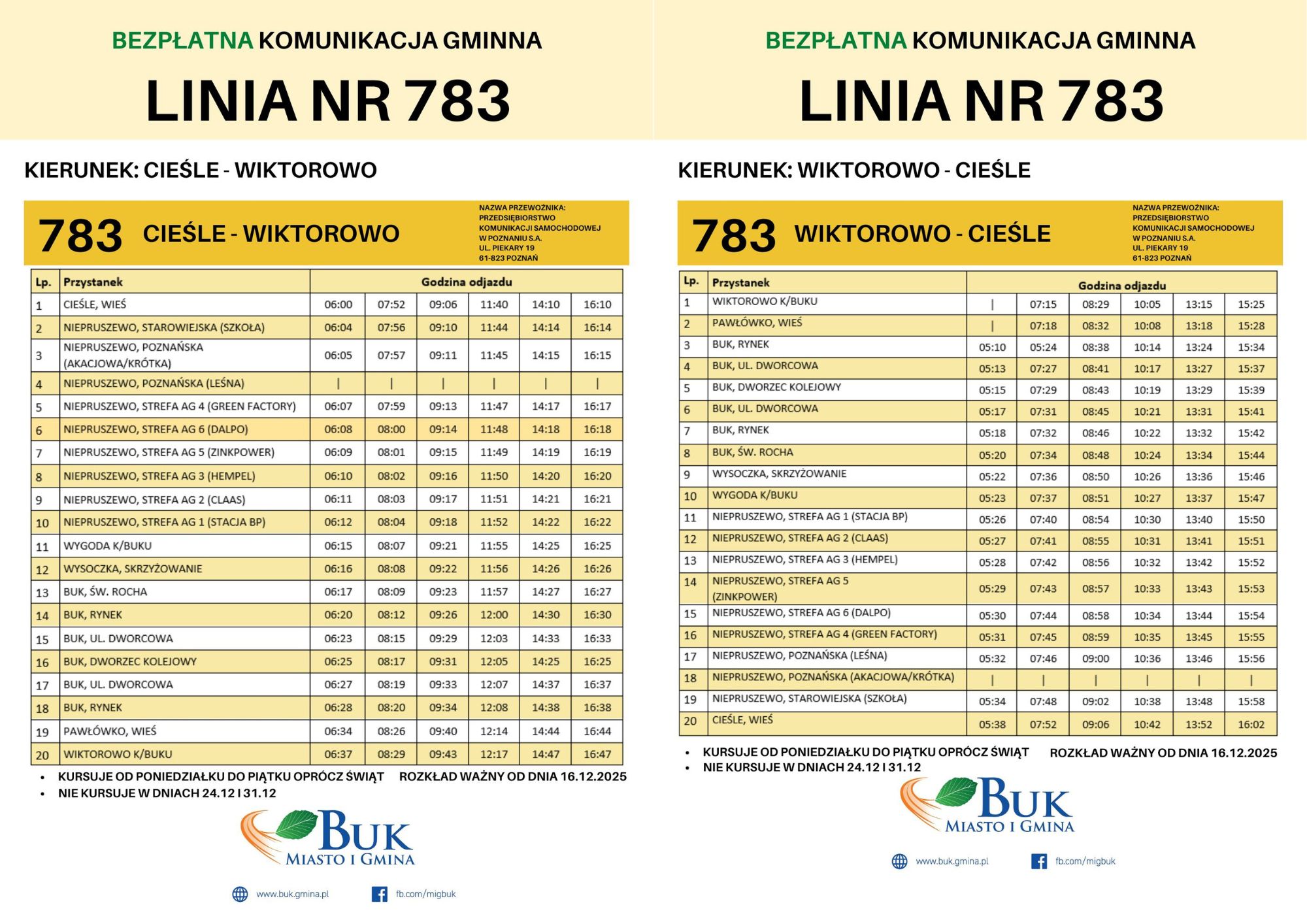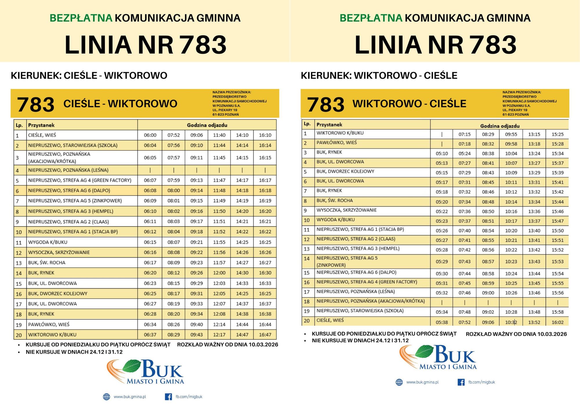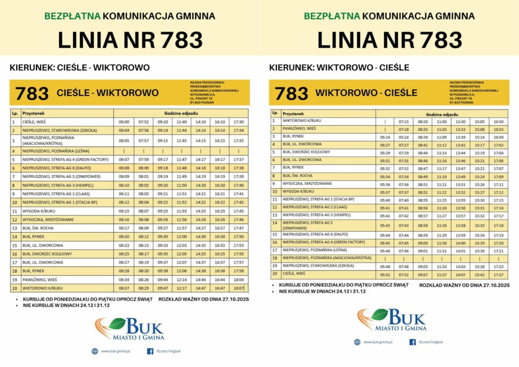 Linia 783 WIKTOROWO – CIEŚLE prowadzi przez Pawłówko, Buk, Wysoczkę, Wygodę i Niepruszewo.