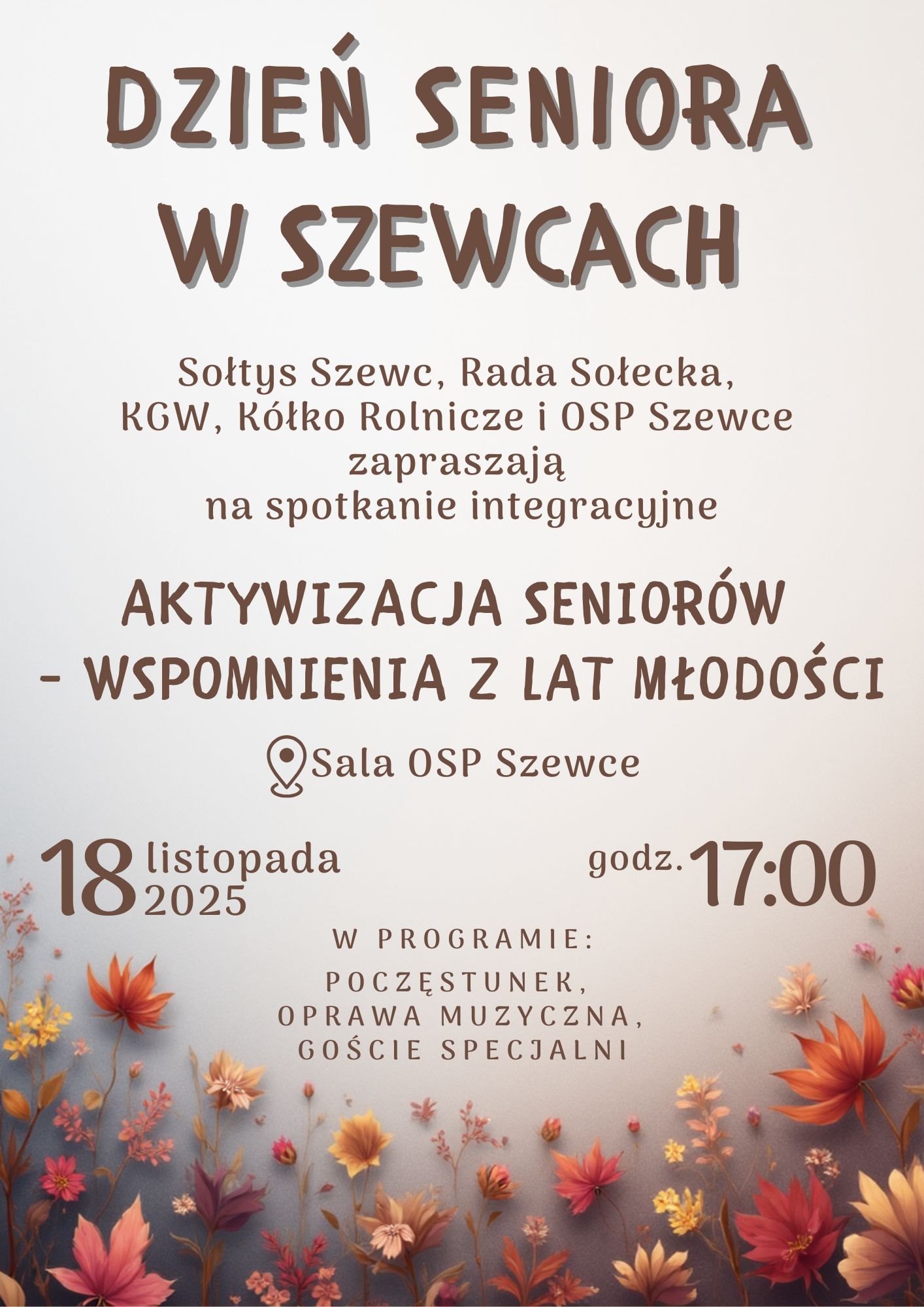 Sołtys Szewc, Rada Sołecka, KGW Szewce i Kółko Rolnicze w Szewcach zapraszają seniorów do sali OSP w Szewcach w dniu 18 listopada br. o godz. 17:00 na spotkanie integracyjne