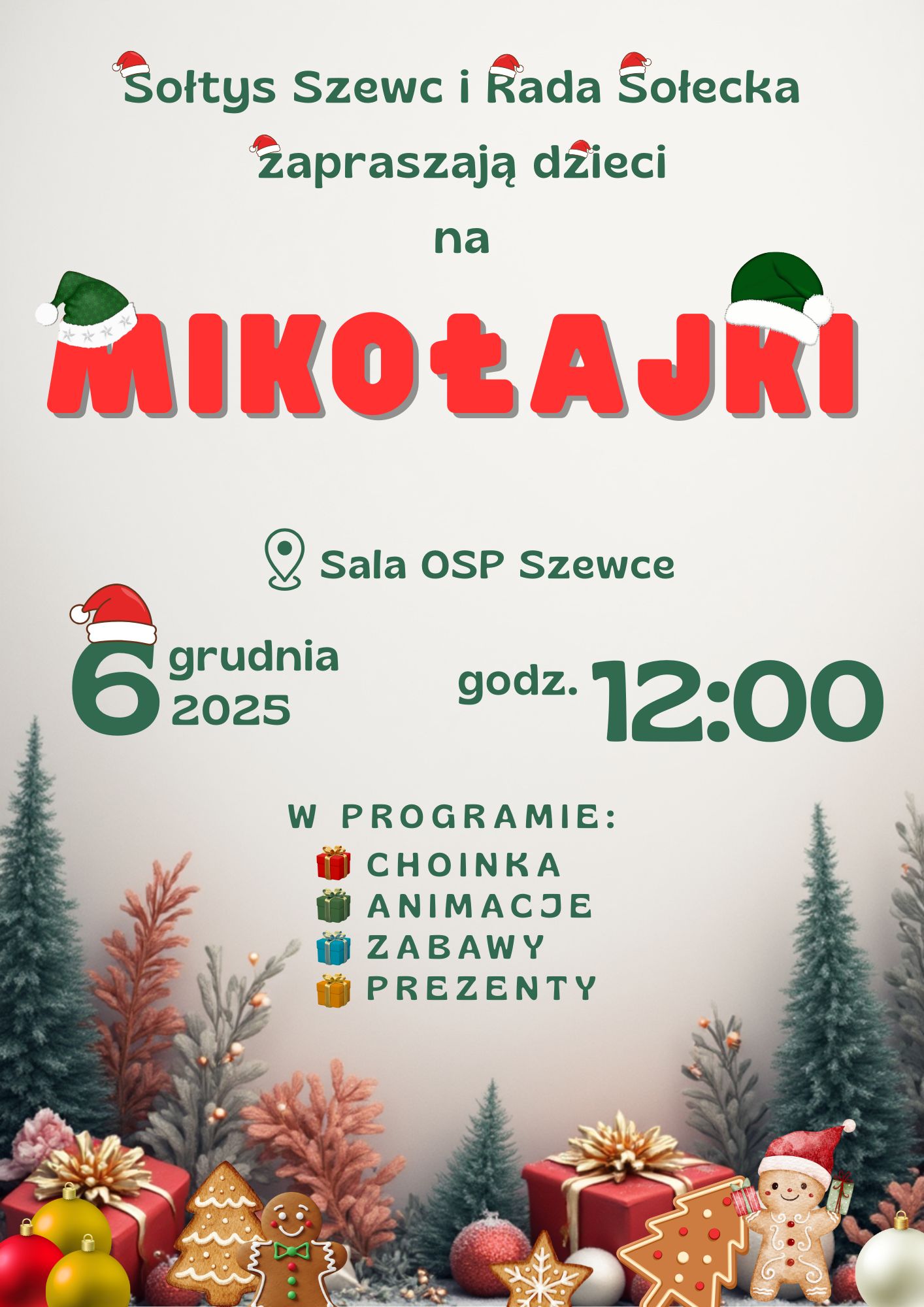 Sołtys Szewc i Rada Sołecka zapraszają dzieci w dniu 6 grudnia br. o godz. 12:00 na Mikołajki.